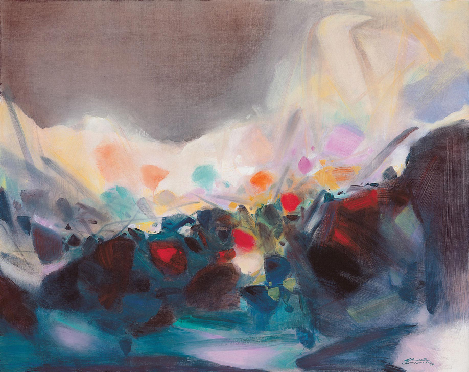 此幅2004年創作的《流露》是他近期的經典作品之一。畫面中各種色階的紅色、黃色和藍色映襯著黑色並佈滿畫面,鮮明、豐富、大膽且變化多端。彩色的點塊如同跳躍的音符,又如繁花,透出明亮清澈的光線,勾勒出藏於畫家內心深處的生命中的甜美記憶。