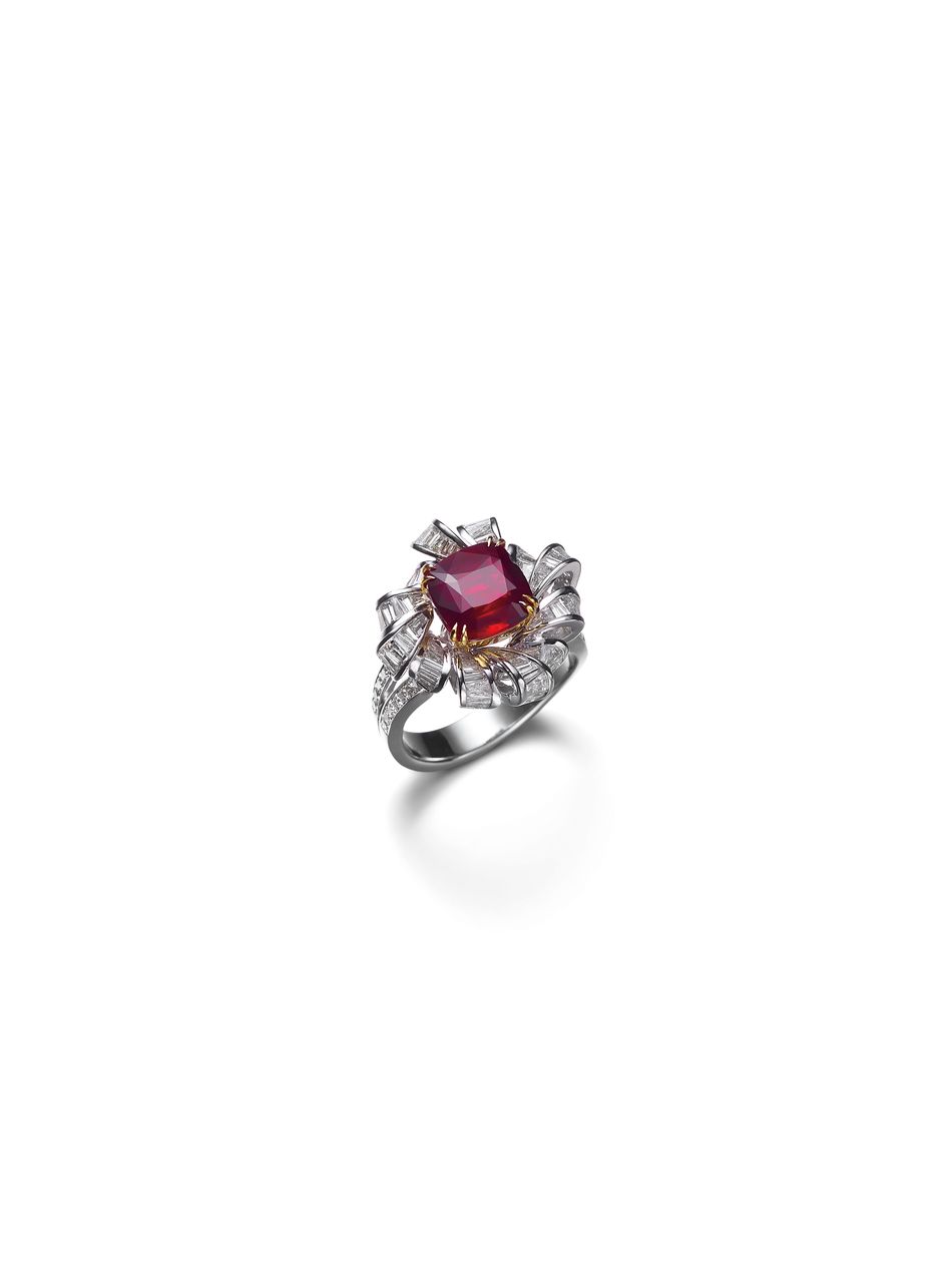 4.01克拉枕形莫桑比克紅寶石配鑽石戒指,未經加熱,附SSEF證書