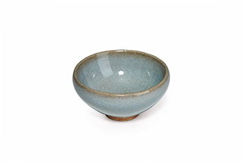 此盞為鈞窯所燒製的天藍釉茶盞,器型十分小巧,外壁施釉到茶盞圈足處,圈足一周無釉,盞底部亦覆蓋有釉水。此種燒製方式被認定為宋代時期鈞窯特征。鈞窯釉水為乳濁釉,燒製時流淌痕跡明顯,口沿一周釉水略薄,可見深色胎體的顏色,接近底足處釉色有微微堆積痕跡。其燒製工藝的精細程度顯示其出身宋代五大名窯鈞窯的身份。