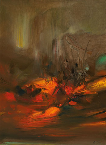 朱德群在1970年於荷蘭阿姆斯特丹的國立博物館欣賞了林布蘭特大展,深深著迷於大師作品裡的光影對比與隨之而起的激越情緒,自此朱德群更用心於光影的經營,為他的抽象繪畫注入了幽微神秘的光采,而1972年遊歷德國時於慕尼黑研究表現主義繪畫,也鼓歷藝術家更為瀟灑地抒發胸中心緒,俐落瀟灑的用筆,在藝術家精準的構圖之下展現流暢力道與美感,為其作品帶來更強大的感染力。《構成 No. 535》一作中,熾烈的橘紅自深沉的黑暗裡穿透而出,如燒紅的鐵塊、亦如地心熾熱的火焰;畫面上半部則以帶著低彩度的黃、綠與藍,蹤向刷出層層流動的薄彩,隱約如拔地而起的崎峻山嶺,亦如天際直射而下的光線,冷調的光影映襯著畫面下方水平動勢的橘與黑更顯熾熱,色彩與光影彼此碰撞、奔騰不息,既熱情又神秘。於是,時間在畫面裡流動,精神高度集中,冰與火的無盡變動在此相遇,清冷與熱烈的光芒相互映照,我們看見了天地萬物的偉大律動,亦感受到熾烈與冷靜共存的情感。朱德群在此畫中運用高超的明暗對比,流暢的筆觸揮灑深沉與清麗的色彩,戲劇性地捕捉了火光劃破漆黑的那一刻,宇宙萬象於瞬間幻化,引人入勝。於是我們見到,璀燦的生命力量於沉厚冥想的氛圍中顯現,如此恢宏且激越人心,在光與色彩流轉躍動的畫面之中,呈現了藝術家走遍千山萬水之後的壯闊與光明,而正是這般雄渾中帶有靈秀的氣質,構成了朱德群畫作的引人入勝之處。