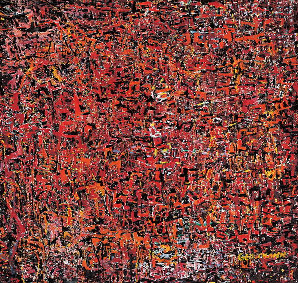 《金石變奏X》挪用青銅饕餮紋飾的文化表徵,混雜紙糊、裱貼等媒材聚合、堆砌,完成一幅碑帖式的現代圖畫書寫。其繪畫是古老文化的尋根溯源,色彩瑰麗、交錯的線性結構具現代感,雖繁複交錯卻有某種秩序感,反映藝術家生活於南加州的繁華都會文化狀態。