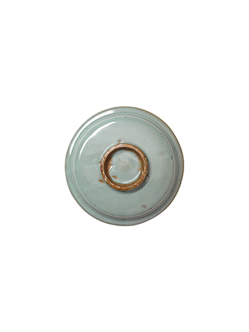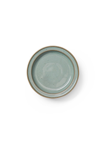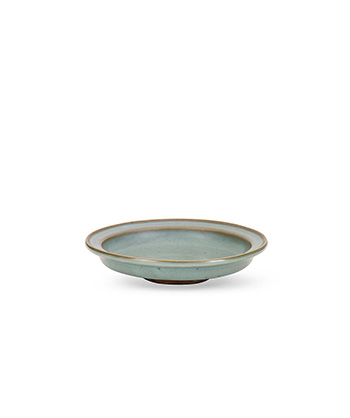 盤口呈現折沿狀,盤式較淺,小圈足,形態簡潔大方。口沿邊緣處釉水較薄可見褐色胎體,全盤素面無紋,釉色呈天青,其明晦深淺變化,隱顯之間,讓人愛不釋手。眾所周知,鈞窯以其獨特的 「窯變」效果享譽世間。