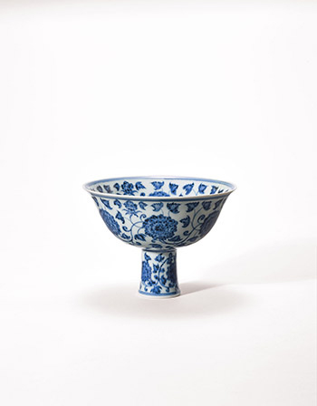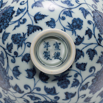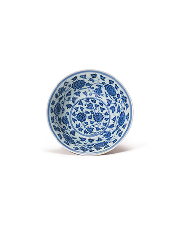 1. 是件拍品的纏枝芙蓉,整體構圖與台北故宮博物院所藏的明宣德〈青花轉枝芙蓉紋撇口盤〉風格一致。詳見:廖寶秀,《明代宣德官窯精華特展圖錄》,台北:國立故宮博物院,1998年,頁424。