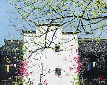 作品《春到徽洲》便是近年來龎均創作中的集大成之作,畫面盎然新生,筆觸嫺熟、色彩樸實、大膽而巧妙地運用黑白灰為基礎,配以淡雅的暖色作為調和,一派春意盎然之氣。作品以黛瓦、粉壁、馬頭牆簷代表的徽派建築為背景,前景盛放的桃花有如帷帳般拉開春的序幕。古老民宅白牆玄瓦的端莊、樸素之美在畫家的描繪中以不同深淺的灰,塗抹出中國古建築牆壁的淺米色,又好像是石膏白,屋頂是靠近黑色的灰。碧空之下樹木也都是鬱鬱的青,屋前樹下晾曬的衣服給清淡的畫面添加了幾分煙火氣。畫中刻意的留白,讓整幅作品色調看起來又是如此的平衡。當徽派建築的青瓦白牆被畫家以黑白線條、簡練構圖、溫和用色進行演繹的同時,這不僅是向他的前人致敬,更是對中國人文傳統的致敬之作。