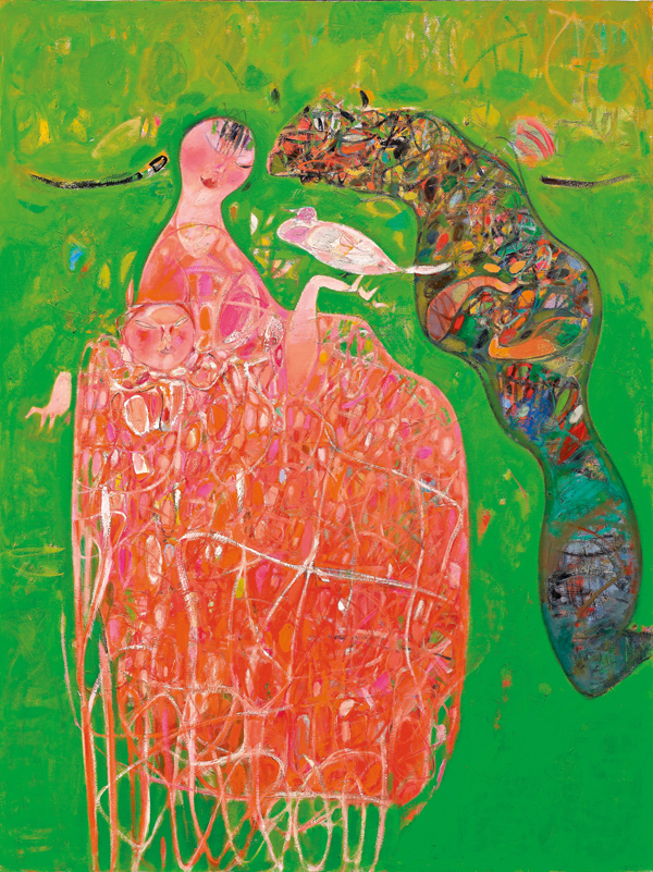 或許藝術家希望藉著畫面傳達出他對家庭、婚姻課題的意念,用「敘事性」的方式詮釋象徵性的人物。黃銘哲的作品,總像是懸浮在天空中,在全然自我的國度裡,豪放的筆刷意圖消減具象形體的動機,透過動態線條的勾勒與重複交疊的色彩,創造出節奏感與張力。作品中沒有固定手法描繪的張牙舞爪,直覺的呈現了藝術家的精神本質,觀者透過畫面將形象個人化,將感情符號化,對心靈做出更深層的探索。