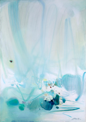 朱德群《一碧萬頃》完成於1983年,此時期的作品在色彩上有更大的突破,以冷色調的藍綠為主調,預示了後來所發展的白色詩意風格,飛白清透的光線,呈現星辰般的輕盈醉人的氛圍,光線照射過後的無限次元與空間與時間所交織而成的宇宙,有如探索宇宙空間的心靈昇華。抽象表現主義構圖、筆走龍蛇的書法技巧,加上無盡的微光,優雅、舒暢、灑脫的筆致,更是表現了大自然的生命流動,在他畫筆下所呈現的,是物我兩忘的靈性宇宙,而觀者藉由他的筆法、用色和結構,也展開了一趟精神遨遊。