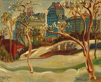 在看盡巴黎的沈淪以及對異邦文化的歧視後與種種外在因素,朱沅芷最終還是黯淡地回到了美國,而此次他選擇落居紐約,展開了第一次的紐約時期,雖其中因為意識到美國當地社會對於華人的歧視與自己在紐約藝壇發展的侷限,且希望再重拾以往在巴黎藝壇的風光,曾二度前往巴黎,卻又因歐戰爆發再次回到紐約。沅芷一生中創作多幅以中央公園為主題的畫作,其原因或許是該地為朱氏和女兒朱禮銀經常前往的地點使得中央公園成為朱氏偏愛的主題之一。而從主題與簽名形式看來,這幅《中央公園》約莫創作於1940年代,風格上明顯地承襲表現主義手法,但跳脫了在巴黎時發展出力道強勁的表現手法;畫面中遠景的大樓細節線條清新細瑣,而前景的樹景軀幹稍微歪斜變形,表現手法稍具寫實技法味道,並開始走向有著文學敘述性般的現代主義繪畫;而用色雖然較先前明亮及豐富,風景明媚的呈現理當散發出歡愉的氛圍,但卻因多著重在沉重、低明度和混濁曖昧的色調,不免能看出朱氏在心境上對於環境的不滿與情感上的憂鬱。