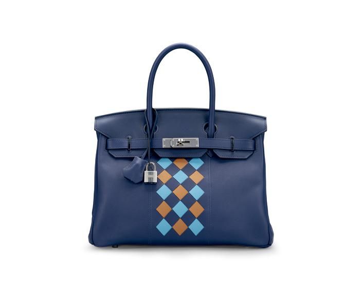 限量版墨水蓝色SWIFT小牛皮, 北方蓝色及驼色EPSOM牛皮30公分TRESSAGE柏金包附银色金属配件