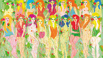 創作年代、尺幅大小或是主題的豐富性,皆是影響藝術家行情的關鍵因素。放眼那些高掛個別藝術家交易排行榜榜首的畫作,多半是重要時期的大格局畫作,或是難得一見的稀有物件。1975年的大油畫《世界小姐》,描繪了18位風姿綽約的各國佳麗,畫幅為222乘以396公分,作品曾經刊載於1977年出版的丁雄泉《紅唇》畫集封面。十八位佳麗並排端坐於前後二排,她們有著嬌媚的眼神與小巧的紅唇,巧笑倩兮,各有各的風情萬種,身穿輕薄衣裳或是裸身,展現豐腴且婀娜多姿的體態。藝術家以各種鮮豔的色彩表現她們豐盈的秀髮,其間綴以盛開的花朵,賦予她們一種奇幻、超脫凡俗的特質。鮮綠色的背景襯托著她們如綻放的繁花。而潑灑於畫面上的滴彩,如煙花、如彩紙,為這場聚會營造出一種節慶般的歡樂與愉悅。丁雄泉的藝術語彙大膽且具有強烈的表現性,他將調色盤上最亮麗鮮色彩並置於畫面上,卻不顯庸俗,紅、黃、藍、紫、綠這些個性鮮明的色彩,在他的手中調合為引人入勝的絢爛,令人不禁讚嘆藝術家對高彩度色彩的掌握能力。