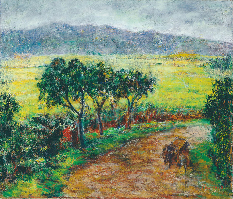 在及長之後,隻身前往東京求學,那時的他二十未到,在異地夜裡,總是思念著家鄉和母親,與故鄉的土地。七○年代開始,創作一系列以故鄉田園風景為主題的作品,其中此件《甘蔗園》便是一件充滿回憶、思念與想像的作品,畫中充滿絢爛的陽光、田園的靜謐,縱使廖德政最屬意秋色之景,仍然掩不住記憶中的微熱、璀璨與乾爽,與之後來的水氣淋漓大異其趣。