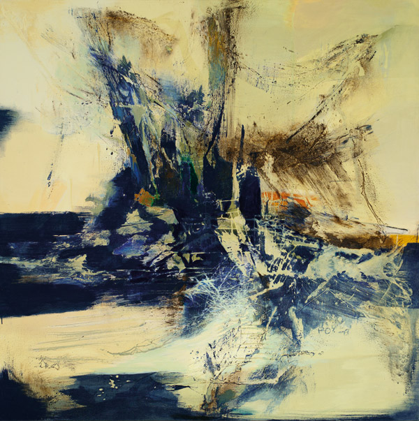 此件《浪淘沙》作于2007年。已经历十数年,杨识宏的抽象的植物的美学已然成熟。画面中仍以杨识宏一贯使用的大地色为主,采取如波浪与土地的色泽,但抽象手法使波涛和自然环境的形貌有所改变,艺术家使之模糊化,成功营造了天地海交会成一片时的激动。除了有画笔的大片挥洒,也有细小点状的细部经营,大器与细腻兼备。