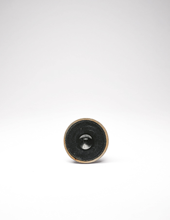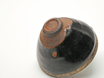 敞口,口緣下微內凹棱,腹下漸收,瘦底,圈足。通體施黑釉,掛釉不及底部,露出紫黑色胎,是典型含鐵量高的胎土所致。釉面局部略有黑、褐相間的兔毫條紋,口緣上鑲有一圈銀扣,銀扣因出土風化略顯斑剝。全器胎體厚實,釉面烏黑亮麗,能臻天目茶盞的精品之流。