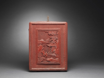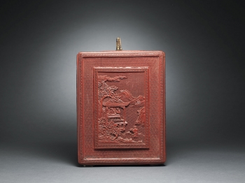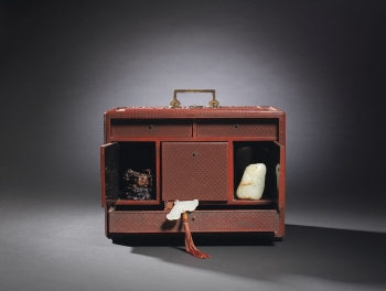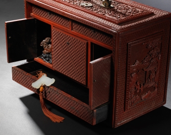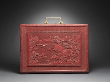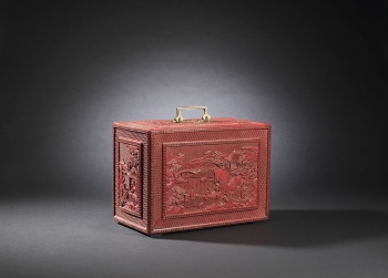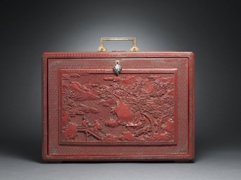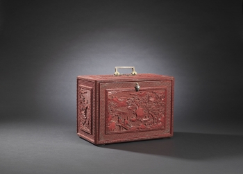 Of rectangular form supported on four feet, the removable panel finely carved through the rich cinnabar lacquer with a central frame enclosing scholars nestled in a terraced lush garden setting engaging in leisurely activities with two attendants nearby and a distant pavilion amidst a mountainous landscape scene within a raised border of key-fret, all reserved on a floral-diaper ground, the reverse and the sides similarly decorated with scholars playing a game of chess, the front set with a gilt-bronze lock opening to reveal a partition of drawers and two compartments in between a central drawer, the top fitted with a hinged gilt-metal double handle with ruyi-shaped ends, the interior and the base lacquered black.