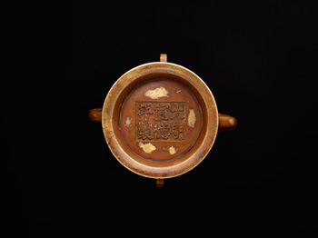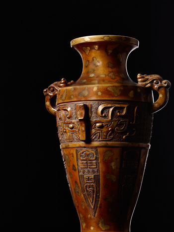 瓶銅鑄,通體點金裝飾。盤口,束頸,溜肩,折腹,腹下漸收,近底足處復外撇,圈足。肩壁兩側起獸首吞柱耳,腹壁上端減地雷紋錦地,上飾浮雕獸面紋,獸面紋下飾一圈凸銜紋,弦紋下飾八卦變形蕉葉紋,底部減地四方框,內署陽文「大明宣德年製」三行六字楷書款