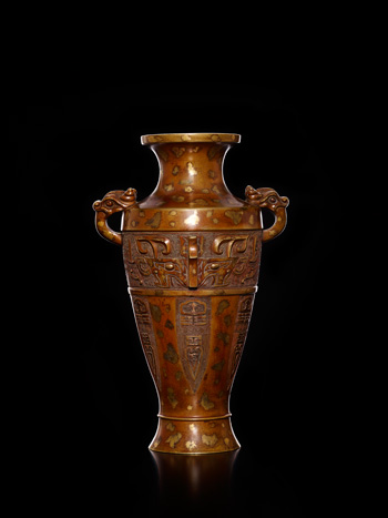 清 銅點金獸面紋獸首吞柱耳瓶