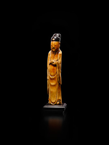 文官以俗稱虯角的海象牙雕成,頭戴.頭冒,.頭另以紫檀雕嵌。寬鼻小眼,嘴上蓄鬚,身著寬袖長袍,右臂置於腰間,手握腰帶,左臂自然垂放,衣褶線條流暢,下露雙足。通體雕工具簡約風姿,但文官一派仙風道骨,展現強而穿透的藝術感染力。