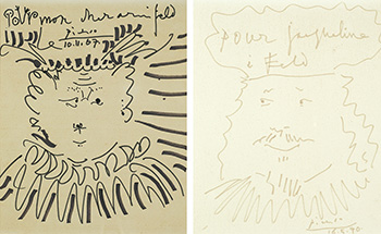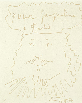 The current set of works of “Roi et Reine” are Picasso’s works on paper painted in late decades. The King was inscribed with “for Jacqueline” on the top, while the Queen was inscribed with “to my dear friend, Feld”. As for this friend of Picasso, Charles Feld, he was the founder of a reputed publisher founder of Editions du Cercle d'art in Paris, which was founded in 1949. In 1969, Feld edited a catalogue for Picasso, “Picasso: His Recent Drawings 1966-1968”, included nearly 400 works of Picasso. In the next year, the portrait of “Le Roi” was born, and perhaps as a reciprocal gift, a pair of the King and the Queen was given to Mr. and Mrs. Feld.