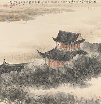 設色 紙本65.4 x 63.7 cm款識:梳洗罷,獨倚望江樓。過盡千帆皆不是,斜暉脈脈水悠悠。腸斷白蘋洲。溫飛卿夢江南後半闕。何懷碩并題。鈐印:阿舒(朱)、多餘生(朱)