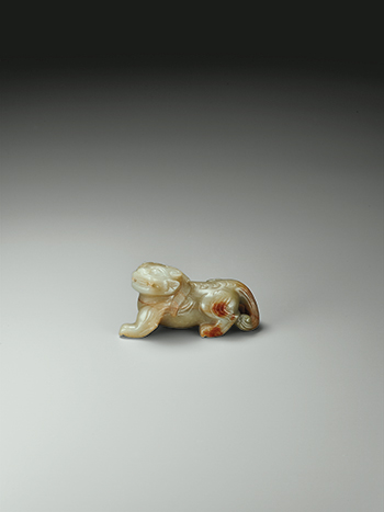 整料黃玉雕成,局部有褐色斑,立體圓雕。瑞獸做屈肢行走貌,前肢一前一後,後肢屈於腹下,昂首前視,額上出雙曲角,如意形尖耳,梭形眼,張口露齒。背部三條平行線表示背脊,背脊兩側有排列規整的捲雲式鬣髮,四肢關節處淺浮雕火焰紋,長尾前曲輕置於地。