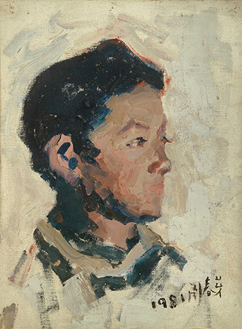此次上拍一系列繪於1981年起的畫作即來自周春芽這段開始建立獨立畫風的時期,畫裡有沉厚的大地色彩、因日曬而顯得黝黑的藏人臉龐與雙手、以及他們身上色彩飽和的衣飾,色彩與形式表現上已然脫離當時學院裡所傳授的、來自蘇聯的社會寫實技法,而融入他在四川美院圖書館裡,偕同張曉剛日日觀摩一本來自歐洲的印象主義畫冊所得的體悟。他以肌理豐富的筆觸展現陽光下的色彩,以充滿力道的線條詮釋藏人的天成之美;大塊面的結構,展現他在形式探索上過人的才氣;例如《藏族婦女像》的溫暖厚實、《藏族老人像》透露歲月風霜,《藏族青年像》則以簡略的筆觸表現身體,與完整描繪的青年臉龐相互襯托得更為出色。而其中《剪羊毛》一作來自於他到若爾蓋大草原的一次拜訪。《剪羊毛》呈現一群藏人圍繞著一頭綿羊剪下羊毛,色彩以粗獷的筆觸堆疊,卻細緻地呈現皮膚、衣料和羊毛在日光下閃耀的不同質地,襯以粗黑的輪廓線,如同歐洲教堂裡的鑲嵌玻璃,散發出一股神聖光采。周春芽在四川美院畢業之際提交了這件作品,不僅入選當時中國美術界最重要的「中國美展」,還獲得了獎項。
