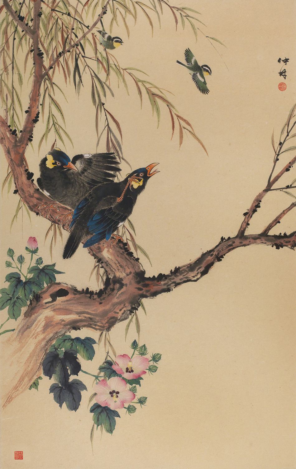 Mynahs on Autumn Willow