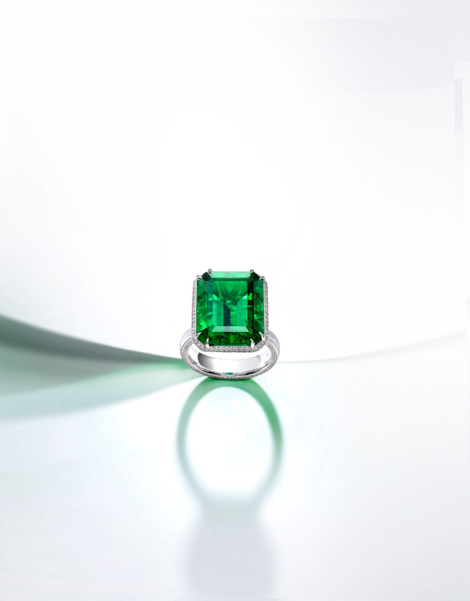 A 15.17 CARAT EMERALD-SHAPED COLOMBIAN EMERALD AND DIAMOND RING, from Muzo mine, no indications of clarity modification.