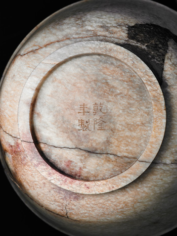 玉質或因經火燎緣故而呈現鈣化現象,通體呈乳濁色,牛毛紋滿布,局部有黑褐色綹線。是碗撇口,深弧腹,腹下漸收,圈足,底面署「乾隆年製」雙行四字隸書陰刻款。是碗外型大器,簡約凝練,具有濃郁的宮廷氣息。