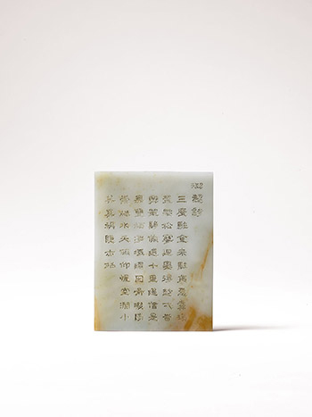 青白玉,局部有褐色斑。長方板片狀,兩面雕工。正面以俯視宏觀視野與剔地浮雕技法,琢飾崇山峻嶺,此間參天古松掩映之處有亭台樓閣數座,幽徑依山勢蜿蜒起伏,激盪出「千山鳥飛絕,萬徑人.滅」的縹緲景象。另一面以陰刻填金技法,鐫〈御製詩〉一首,詩曰:「三度駐金未駐焦,隱虞頓置笑松寥。回鑾得趁一時興,策騎偷逍十裡遙。信是無雙棲淨域,還因有暇涉崇椒。水天俯仰惟空闊,小矣奚稱隱士招。」所鐫字體工整,氣勢飛動,予人莊重端正之感。