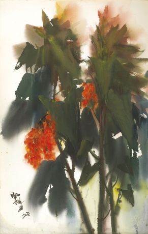 在此幅《海棠花》作品中,席德進以淺影作為背景,使筆下的花沉浸在一種陰柔裡,姿態秀麗,生機盎然;綠葉陪襯著花,朦朦朧朧得像溫柔的夢,舒緩了原本枝葉線條的銳利感。畫家藉由花卉的盛放歌頌生命的豐盛,詠嘆青春的美好。