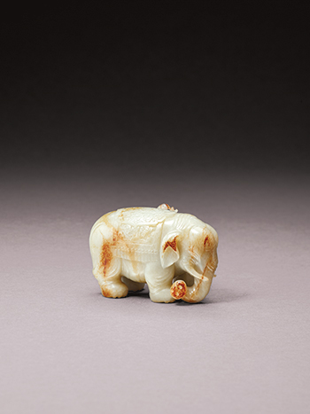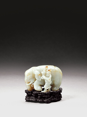 立體圓雕,玉質略顯青白,局部有褐色斑。通體做一巨象,呈立姿,低首,左前足微屈,長鼻曳地,嘴出彎牙,大耳垂於兩側,身披鞍毯,毯上淺浮雕五福拱壽圖。一胡人立於巨象旁,手捧寶瓶,瓶上插靈芝雜寶,傳達海宇太平、胡人獻寶的康泰瑞兆。