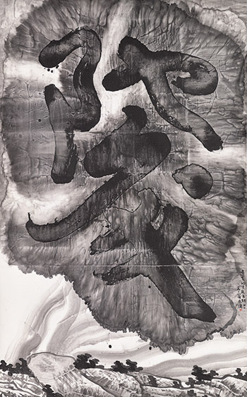 1983年至1986年間,他在浙江美術學院創作的《遺失的王朝》系列作品中,解構和重構的篆書字體多以書法的形態呈現。進入1990年代中期之後,他逐步將自造的字體與傳統水墨山水結合。傳統水墨的勾線,暈染,潑墨與不能辨別的「谷氏簡字」結合,形成風格獨特的畫面。他用微妙的文字關係反映錯綜複雜的傳統與歷史,被解構的文字顛覆和破壞了傳統觀念和形式體系。這種文字與圖像的思辨與美國普普藝術大師愛德華.魯沙有異曲同工之妙。魯沙關注的更多是美國流行文化與文字的關係。在西方藝術傳統中,文字一直被視作是對圖像的入侵,而魯沙則用文字來構建圖像,創作作品。相反地,中國的文人畫傳統中,優雅的詩文是對畫面的補充說明,書畫不分家,畫面上的題字與詩詞協助觀者理解畫面或作者抒情的方式。在Lot 070《遺失的王朝G系列十號》中,作為畫面補充說明的文字成為了畫面的主體,淡墨勾勒的山石和濃墨點染的樹叢構成的山水圖示則反主為客,退居從屬地位。看似熟悉的圖像挑戰著人們對於傳統中國畫的認知和理解。1987年谷文達移居美國,他在文化接受和藝術表達上獲得了跟多的空間。《遺失的王朝》系列也隨之延展了其文化內涵的深度和廣度。從1980年代早期的繪畫探索延展至書寫性的文字實驗,再將書寫與傳統圖示相結合,拓展說莫的邊界。他的實踐證明瞭中國的文化符號也可以在世界文化中具有普遍性,得到廣泛的共鳴。