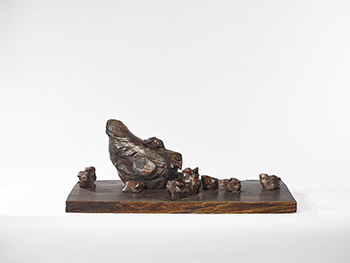 在1982年由漢雅軒和春之藝廊共同出版的《朱銘雕刻》目錄中,編者黃玉珊便曾在文章中提及朱銘源於草根的生命力,因朱銘「在農村長大,又當過牧童,由於早年和大地及畜類的接觸,使得他對自然始終抱有一份親切感,在早期作品中便很明顯地反映出對大地、自然的讚頌,如《伴侶》、《阿母》(本拍品)⋯就融入了個人對鄉土、傳統文化的愛慕與承續香火之情,這種讚頌,跨出了鄉土的範疇,就成為對人類的愛與讚美。」