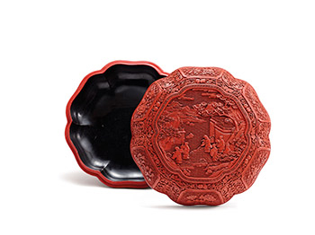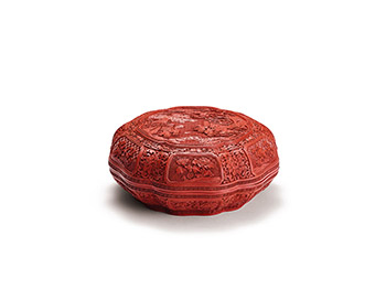 盒做葵瓣式,從子母口分出蓋與盒,通體髹厚朱漆,內壁與底部髹烏漆。頂面開光內雕亭閣人物,開光外飾一圈二方連續方雷紋,方雷紋下飾一圈「福壽如意」紋,腹壁做六組開光,開光內飾錦地折枝花卉,倆倆開光間復綴以朵花,盒身外壁的紋樣與蓋腹雷同。全器雕工精細,構圖繁縟,具十八世紀的美學裝飾風格。