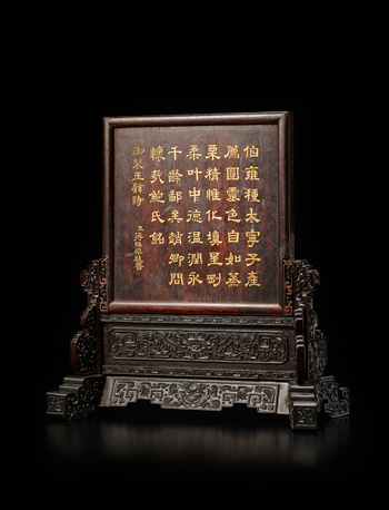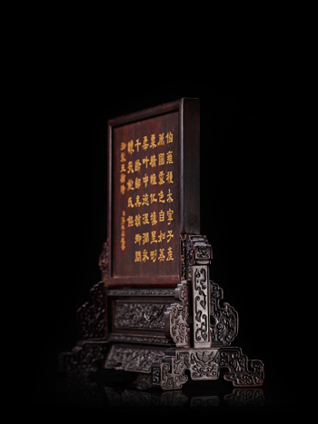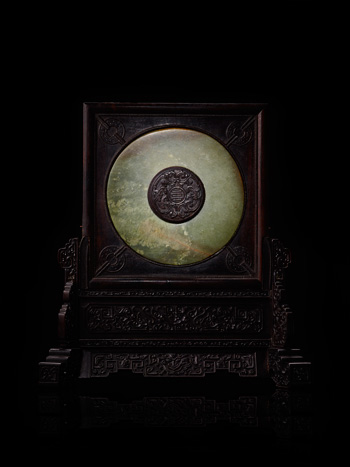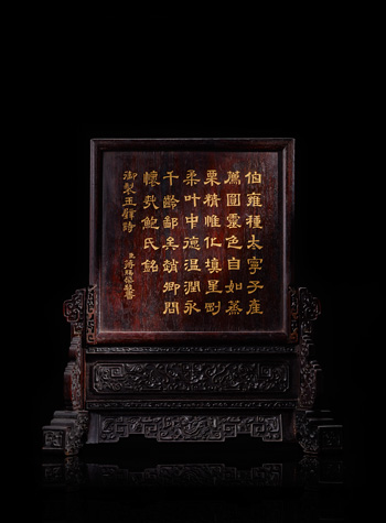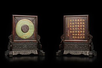 The Imperial inscriptions on the present lot eulogizes the disc and the poem reads:詠黃玉璧伯雍種太寧子產薦.靈色自如蒸栗精惟化填星剛柔.中德.潤永千齡鄙矣趙卿問懷哉鮑氏銘御製玉璧詩臣蔣賜棨敬書 Roughly meaning: Imperial poem of Jade bi According to the book Sou Shen Ji (In Search of the Supernatural) of the Eastern Jin dynasty (AD 317-420), Yang Bo Yong plants seeds of stone to grow jade. During the Spring and Autumn Period (770-476 BC), Zi Chan, a statesman of the State of Zheng, refused to sacrifice precious jade wares for the prevention of fire disaster. Fine quality yellow jade exhibits colour resembling the steamed chestnut and the “earth star”, Saturn. It should be neither too hard nor too soft and has shiny luscious appearance that last for eternity. Zhao Jianzi, Minister of the Jin State in Eastern Zhou (770-256 BC) coveted the jade pendant, a national treasure of the Chu State. He once asked Wang Sun Yu, an official of the Chu State if the jade pendant was still in the State. The Inscription of Jade Bi written by Bao Hangqing of the Southern dynasties (420589) is memorable. Written by the official Jiang Ciqi (1730-1802) The Collected Poetry of the Qianlong Emperor contains over seven hundred poems on jade, which testify to the importance of the material. The intricately carved table screen not only has an ornamental value of beautifying the surroundings, furnishings