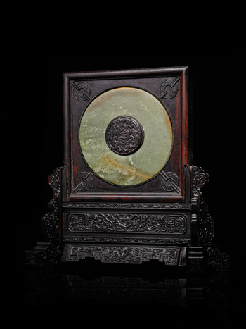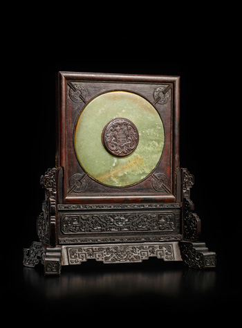 The plain bi of greyish green with cloudy creamy white and strikes of russet inclusion, mounted in a square zitan frame carved with four in circular motif in the four cardinal directions, the bi secured by a central plug carved with the trigrams qian of Qianlong, the reverse inscribed with a gilt poem within the rectangular panel, the frame fitting into a stand carved with archaistic scrollwork and raised bosses above a central taotie mask set in between further archaistic scrolls on the apron, resting on a slightly slanted feet, the material of even dark colour with characteristic graining.