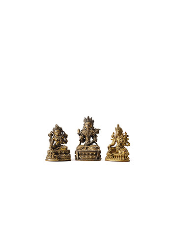 銅鎏金佛教造像一組三件,其中左右兩件呈右舒坐的為度母造像,正中呈全跏趺坐者為金剛薩埵造像,三造像造型小巧,然雕工細膩,法像莊嚴,屬可隨身攜帶觀想的精湛小品。