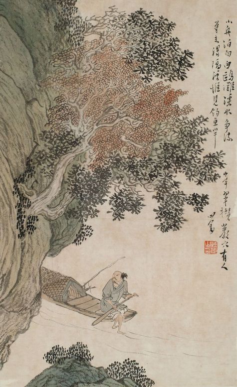釋文:小舟泊向白鷗灘,溪水爭流峯翠攢。 巖穴有人尋未得,隔溪惟見釣魚竿。