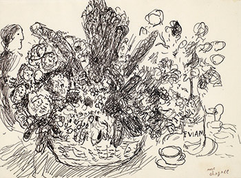 《花籃》描繪一籃盛開的花,生動鮮明,如夢似幻,旁邊擺著一杯茶和一瓶Evian礦泉水,以插畫的效果呈現。中央的花籃後方,可以看見人臉的輪廓,隱約顯示出畫作的視角與空間感。藝術評論家羅伯特.休斯(Robert Hughes)形容夏卡爾是「典型的二十世紀猶太藝術家」。他是現代主義的先驅,經歷巴黎現代主義藝術的黃金時期,成功將立體派、野獸派和象徵主義揉合在他個人獨特的繪畫技法中。夏卡爾出生白俄羅斯。1907年,離開俄羅斯,前往巴黎。第一次世界大戰爆發時,他被困在俄羅斯,在1923年回到法國。第二次世界大戰期間,他被迫逃離法國。在美國尋求庇護的期間,他從事舞台與舞台服裝設計,一直到1948年才回到法國。這時,夏卡爾開始嘗試不同的藝術創作模式,運用的媒材包括插畫、雕塑、製陶、舞台織品設計、彩繪玻璃窗。他曾為許多世界各地的建築創作大型藝術品,包括 1961 年耶路撒冷郝得塞希伯來大學醫學中心(Hadassah-Hebrew University Medical Center)猶太教堂的彩繪玻璃窗,以及1964年巴黎劇院天花板壁畫和紐約大都會歌劇院的壁畫。1977年,夏卡爾獲頒象徵法國最高榮譽的大十字榮譽勳章。同年,羅浮宮為他舉辦回顧展,這是少數傑出的藝術家才能享有的殊榮。