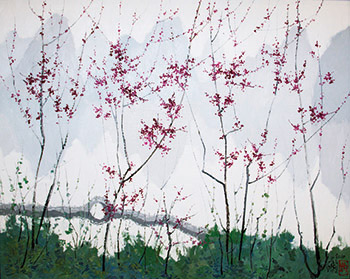 《春江花開時》以深深淺淺的紫紅、桃紅細細描繪出春天盛開的桃林,顯現出龎均的妙筆生花,好一處詩意風光。桃枝纖細交錯,橫過畫布,襯著後頭瀟灑恣意的藍色筆觸,盛放的桃枝正是由此冒出,同時也象徵春天降臨。背景中一座曲橋掩掩映映,前景中開花的桃枝倚著自然主義的春風搖曳,創造出一片無垠的、深淺灰色調子的視覺幻象,讓觀者浮想連翩。水光瀲灩,映出附近山峰的倒影,讓人忍不住深思自然之美。龎均汲取寫實主義及文人畫的傳統又加以轉化,藉由對色彩的高妙運用鎔鑄出一套獨樹一格的藝術語彙。龎均曾說「大陸是屬於大山大水的情景,有一種灰調子,我在黃山寫生時就體驗到為什麼國畫有皴法的產生,但還有一個難題,就是在這個灰調子的表現上。我在文革時的風景畫就是因為這個灰色調的表現而被人喜歡。大家都知道有一個畫灰調子的龎均。那時對於大陸的大山大水的觀察,我就覺得必須是灰調子,因為這也應驗了在中國詩詞裡的韻味和飄渺,和中國人所隱藏的情感收斂深沉,這都是同一個精神性。」龎均眼中的東方之珠