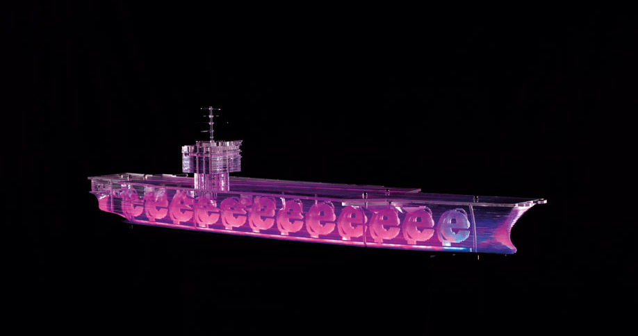 《方舟二》這件作品便是以壓克力板與不鏽鋼材質製成,冷峻平實的造形傳達《聖經》諾亞方舟的警世意涵,LED燈穿透方舟透亮的壓克力形體,強調出層層堆疊的視覺深度,並使其外觀呈現冰冷、靜謐的藍色調,營造出宗教儀式般的神秘氣氛,使觀者進入一種撲朔迷離、真實而又虛幻的情境中。