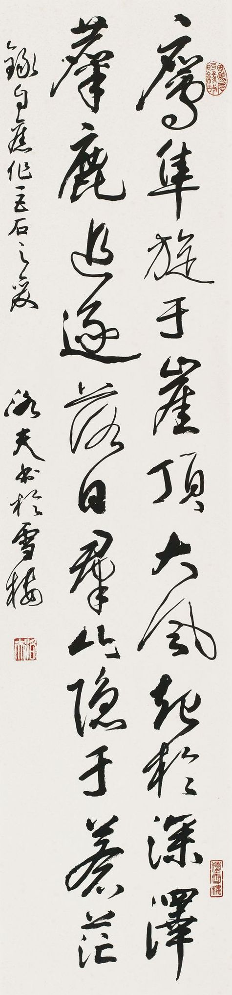 釋文:鷹隼旋於崖頂,大風起於深澤,麋鹿追逐落日,群山隱入於蒼茫。