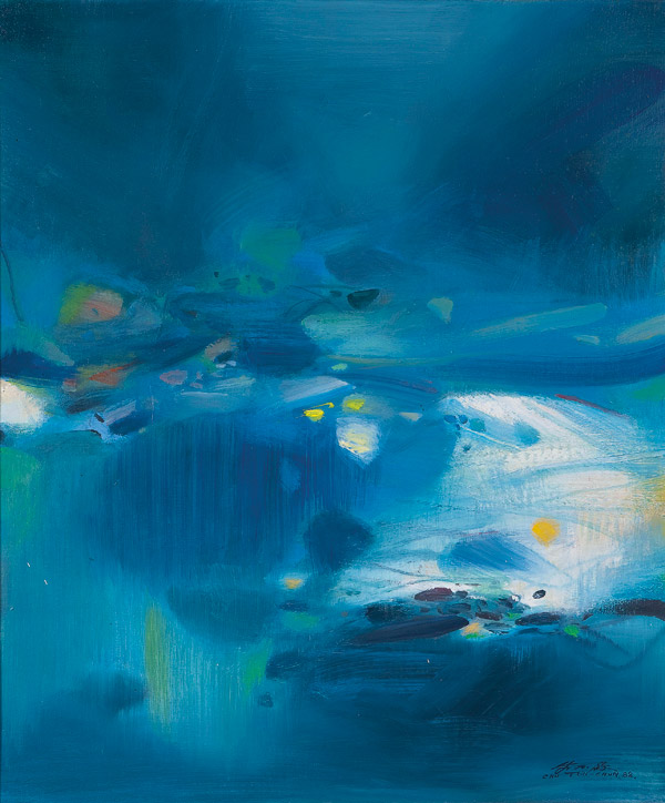 1980年代中,朱德群充分運用中國的書法繪畫的線條、點與粗筆,中國書法的俯仰、頓挫與縱橫均可見於這個時期的作品當中。到了 80年代後期,朱德群趨向對自然光線作更深入的詮釋,並試圖把更多色彩納入畫面中,以更豐富、更具情感的創作手法,延續中國文化精神議題,更將色彩納入他創作中,展現出更為豐富、多情的一面,如1988年創作的《藍色氛氳》,充滿動感的佈局,畫面肌理得體,準確優美,極富表現力。畫面中如韻律跳躍、節奏雄健,似交響樂般的點塊表現,無不既融匯了中國草書俐落瀟灑的用筆,又呈現了西方韻律、節奏的視覺美感。