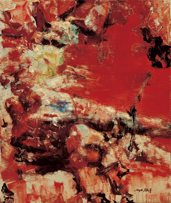 山石畫法是傳統山水畫中重要之門類,勾、皴、擦、染、點五個步驟,山石的形態、山石的構造,決定了不同的表現手法,進而形成不同風格與流派。山水畫家長期觀察自然現象提煉出筆法符號,將中國山石圖像塑造得深邃曼妙。反自然色彩的運用是周春芽作品中的典型風格。90年代初,周春芽以花卉、山石為繪畫主題,畫家借助德國新表現主義的繪畫方式、技巧,大膽用色使畫增添異彩,以濃豔的紅色重新詮釋山石和花卉,面貌迥然相異,顏色跟自然不同,放於畫面大片的空白中,筆法精練,個體抽象獨立,表面被一層奇怪的增生物覆蓋,暗示出模糊的天然本性並詮譯了文人繪畫「溫和、內向、惰性」。