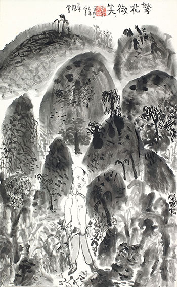 Signed upper center Yu Peng, titled Holding Flowers and Smiling, inscribed Ping yang hall, dated 1990 all in Chinese