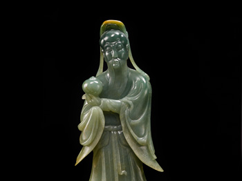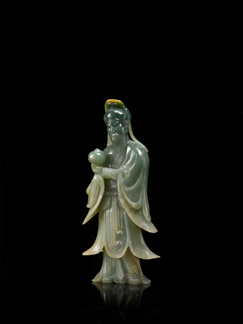 整料翡翠雕成,東方朔頭戴巾冠,寬顙豐頤,頷下一綹長鬚,目光如炬,身著寬袖長袍,袍下束長裙,裙襬下露雙足,腰繫絲帶,雙臂交於右側胸膛,手托蟠桃,一派智者長壽的仙風道骨模樣。也讓人聯想東方朔偷桃的寓言典故。