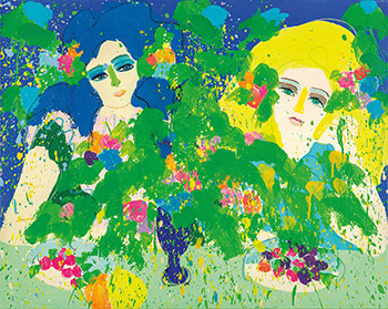 自稱為「採花大盜」,丁雄泉將自己比擬為翩翩飛舞於花叢之間採集花蜜的花蝴蝶,只不過,他採集的是鮮麗動人的色彩,並且透過他精湛而獨特的表現手法,將色彩釀造成一幅又一幅豐沛迷人的繪畫,真誠地讚頌生命的美好。完成於1976年的《迷雅與愛麗克絲》展現了丁雄泉卓越的色彩駕馭能力,他融合了野獸派的大膽用色、以色彩層次取代單點透視的空間鋪陳,並採納抽象表現主義的滴流技法,呈現了在鮮花綠葉簇擁之間巧笑倩兮的兩位女子,是藝術家風格成熟的精采作品,特別是如此大尺幅的布上繪畫,在丁雄泉以紙本居多的作品當中,更顯得稀有珍貴。