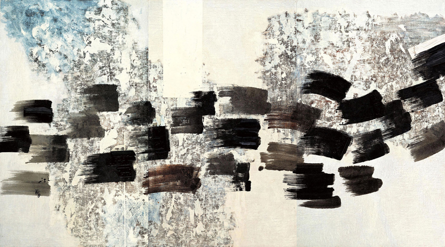 As for his forms of painting, black and white have been Wang's main colors since the mid 1980's. This reminds people of his mentor: Wu Guanzhong. Wang has discovered the purity and strength of black and white from various sources such as the white walls and black tiles of the ancient buildings to the south of the lower reaches of the Changjiang River, and the structures of traditional calligraphy. Black and white is the most important pair of colors in Chinese painting inheritance, and our ancestors' sentiment of the two colors has been inherited over a long history. Black, at the ultimate level beyond any other color, calls out the inner connection inside traditional Chinese art. Wu Guanzhong guided and transited from B&W colors to the structure of abstract paintings. This enlightened Wang Huaiqing to make the same selection of the contradiction and counterpoint of B&W. He deliberately blackens the furniture in the paintings to alter the original color of the object and to change it into a form of art. This also reflects Wang's effort of tracing and connecting to the origin of culture. Wang is good at dealing with the texture of paintings. He manages to make mottled spaces between B&W. Those spaces represent the trail of history and enrich the expression of the paintings.