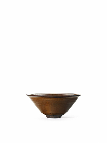 D: 13.1 cmH: 5.8 cm此件建窯柿釉斗笠茶盞敞口,斜直腹,胎骨厚硬堅實,釉色黃而潤澤,器內外施柿黃釉,底部露胎,釉汁垂流厚掛,有的凝聚成滴珠狀,釉面呈現褐黃色。遠觀之,猶如茶葉末釉的質感,斑點呈繁星分佈,給人一種自然的美感,為建盞中的極品。