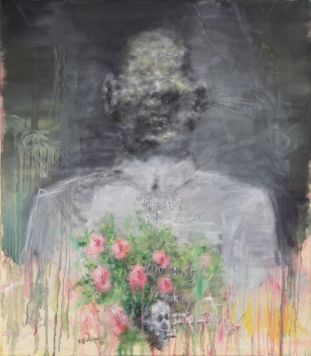 Liu Wei was one of the first Chinese contemporary artists to have their work featured in major international exhibitions. Liu’s paintings depict the changes in young people’s values that emerged in China’s Reform Era, reflecting the pronounced impact that changes in the political and economic environment had on ordinary people’s lives. A focus on material desires runs through much of Liu’s recent work; another underlying theme is an interest in how the human figure has traditionally been portrayed. After the “Revolutionary Family” and “Swimming” series, Liu transferred his attention away from the military and political personages of the Revolution towards anonymous human figures. The painting “Who Am I” included in this auction is one of Liu’s finest works from this period. On a gray background, a figure with a blurry, misshapen face stands erect in the center of the scene. The bright, colorful (yet blurred) bouquet of pink flowers at the bottom of the canvas catches the viewer’s attention, while the smoking skull seems to complement the human figure in the middle of the painting. The picture has a strongly layered composition; the seemingly random streaks of paint actually provide an “orderly transition,” creating a sense of graffiti- like bantering discourse, a feeling of decadence and nihilism.