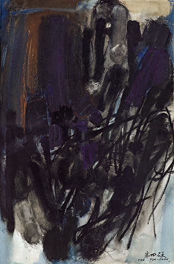 《抽象》一探朱德群澎湃的抽象藝術世界。畫中雄渾與精細的筆觸交錯並陳,蘊含超脫形體的詩意與玄妙,邀請觀者一同進入夢迷之境。本拍品上部狂風吹拂,充滿律動而相互激盪的線條於搖曳的廣闊空間中擺漾,於精微之處展現出畫家靈活的技法。本作體現朱掌握自然界的和諧精妙之處,筆觸飽富能量與靈思;豪邁不羈的線條聚纏成一派喧騰之流。《抽象》寄於有形與無形之間,處於須臾與永恆之界,體現朱德群變化萬千的無窮宇宙,引導觀者徘徊其中。